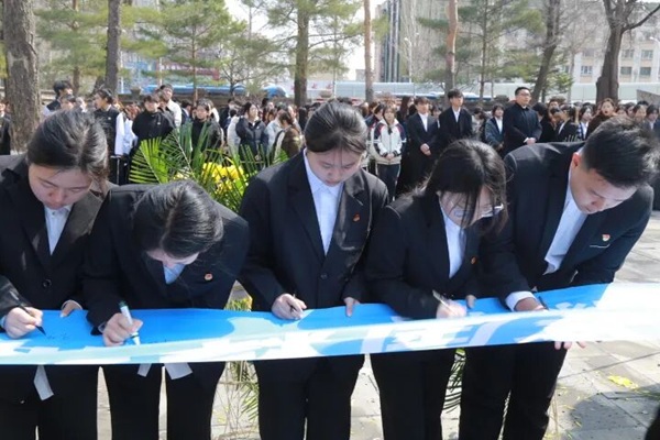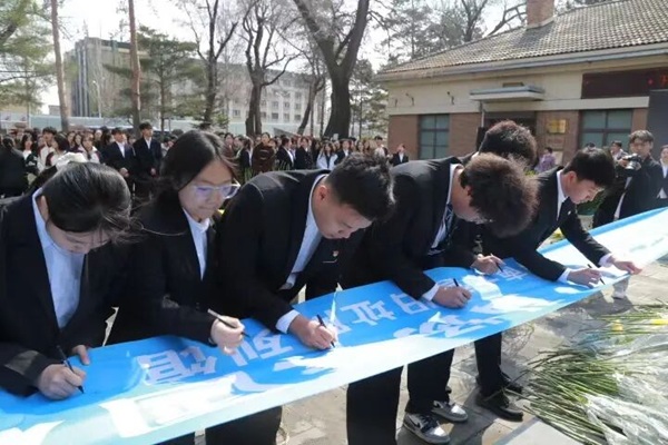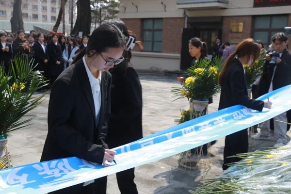 参观结束后,一条写有“缅怀先烈、强国有我”的蓝色条幅在阳光下格外醒目。同学们依次走上前,郑重签下自己的名字。一笔一划,既是承诺,也是誓言。